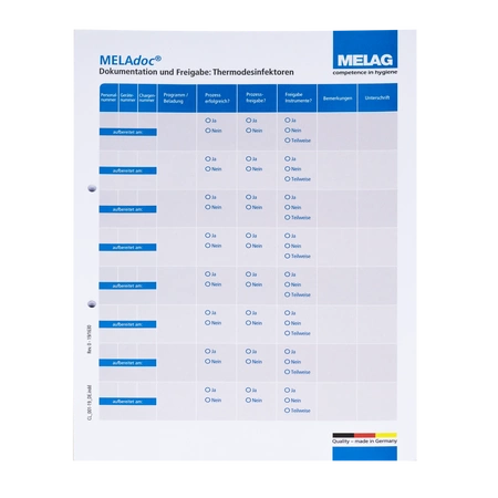Arkusze dokumentacji MELAdoc to profesjonalne narzędzie stworzone z myślą o precyzyjnym, systematycznym i zgodnym z obowiązującymi normami dokumentowaniu procesów mycia oraz dezynfekcji w myjniach-dezynfektorach. Oryginalne formularze MELAdoc umożliwiają rzetelne prowadzenie ewidencji cykli czyszczenia, co stanowi kluczowy element zapewnienia bezpieczeństwa pacjentów i personelu oraz spełnienia wszystkich wymagań sanitarno-prawnych.