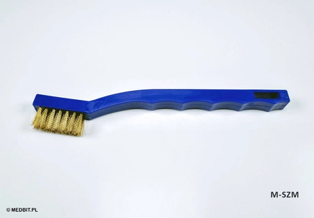 Szczotka mosiężna do czyszczenia narzędzi i wierteł 18 cm MEDBIT.PL – niebieska rączka, drut miedziany, M-SZM
